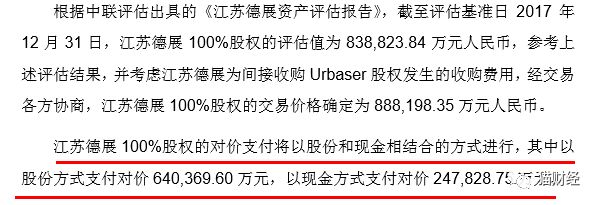 根據(jù)中聯(lián)評估出具的《江蘇德展資產(chǎn)評估報(bào)告》,截至評估基準(zhǔn)日2017年12月31日,江蘇德展100%股權(quán)的評估值為83.88億元人民幣,參考上述評估結(jié)果,并考慮江蘇德展為間接收購Urbaser股權(quán)發(fā)生的收購費(fèi)用,經(jīng)交易各方協(xié)商,江蘇德展100%股權(quán)的交易價(jià)格最終被確定為88.82億元。