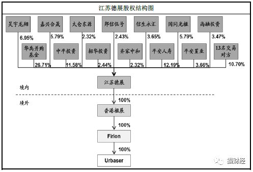 至此,有26名交易對方合計(jì)對江蘇德展持股100%,江蘇德展又依次通過香港楹展、Firion間接持有Urbaser100%股權(quán)。