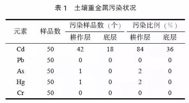 為研究污染場(chǎng)地對(duì)周邊農(nóng)田土壤重金屬的影響程度,選取國(guó)家GB 15618-1995 《土壤環(huán)境質(zhì)量標(biāo)準(zhǔn)》中的2 級(jí)標(biāo)準(zhǔn)作為閾值。采用單因子指數(shù)法對(duì)水泥廠周邊農(nóng)田表層土壤總體環(huán)境質(zhì)量現(xiàn)狀進(jìn)行評(píng)價(jià),結(jié)果如表1 所示。水泥廠周邊農(nóng)田土壤Pb和Cr 沒有呈現(xiàn)污染特征,但土壤As 和Hg 已呈輕度污染,分別有1 個(gè)樣點(diǎn)質(zhì)量分?jǐn)?shù)超標(biāo),超標(biāo)率為2%;而土壤Cd的污染已較為嚴(yán)重,超標(biāo)樣點(diǎn)數(shù)達(dá)42 個(gè),超標(biāo)率高達(dá)84%。同時(shí)又采用內(nèi)梅羅污染指數(shù)法進(jìn)行綜合評(píng)價(jià),以綜合指數(shù)大于1 為臨界值。結(jié)果表明,石灰廠周邊農(nóng)田耕作層土壤共有33 個(gè)樣點(diǎn)超標(biāo),超標(biāo)率達(dá)66%,最大值達(dá)到1.90;底層土壤共有6 個(gè)樣點(diǎn)超標(biāo),超標(biāo)率達(dá)12%,最大值達(dá)到1.72。根據(jù)《農(nóng)田土壤環(huán)境質(zhì)量監(jiān)測(cè)技術(shù)規(guī)范》土壤污染分級(jí)標(biāo)準(zhǔn),該區(qū)域?yàn)檩p度污染等級(jí)。