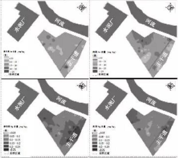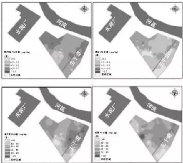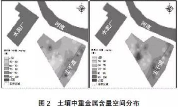 插值結(jié)果表明,該區(qū)域農(nóng)田土壤重金屬含量以水泥廠和公路為中心呈輻射狀分布。地統(tǒng)計(jì)學(xué)研究方法可以對(duì)區(qū)域土壤污染源的識(shí)別加以指導(dǎo)和檢驗(yàn)。由于污染場(chǎng)地周邊農(nóng)田土壤重金屬含量的超標(biāo)與周邊污染源的影響密切相關(guān),因此要密切關(guān)注污染源對(duì)周邊農(nóng)田土壤重金屬的污染問題。