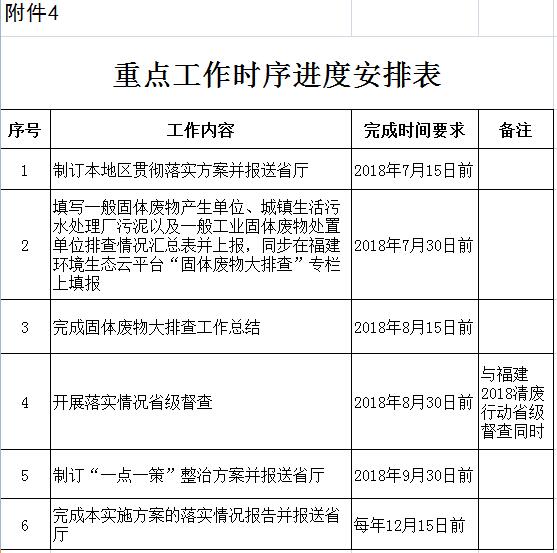 ---2018年7月30日前,市級(jí)環(huán)保部門在縣級(jí)環(huán)保部門填報(bào)的基礎(chǔ)上,將一般固體廢物產(chǎn)生單位、城鎮(zhèn)生活污水處理廠污泥以及一般工業(yè)固體廢物處置單位排查情況匯總表(附件1、2、3)上報(bào)省環(huán)保廳,并同步在福建環(huán)境生態(tài)云平臺(tái)“固體廢物大排查”專欄上填報(bào)。