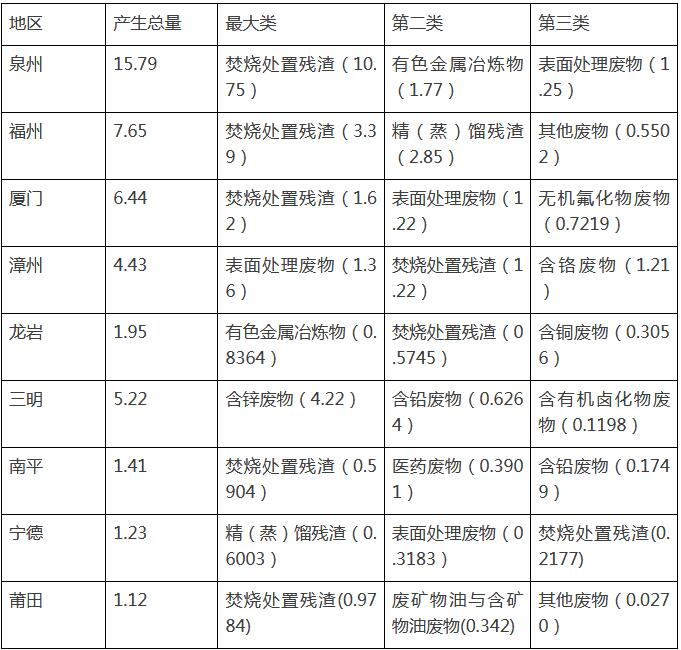 2016年福建省省危險(xiǎn)廢物產(chǎn)生量合計(jì)為86.62萬噸,綜合利用量為56.27萬噸,處置量約為27.33萬噸,貯存量為14.11萬噸。福州市危險(xiǎn)廢物產(chǎn)生總量為7.65噸,主要是焚燒處置殘?jiān)?.39萬噸、精(蒸)餾殘?jiān)?.85萬噸、其他廢物5502噸;寧德危險(xiǎn)廢物產(chǎn)生量1.23萬噸,主要是精(蒸)餾殘?jiān)?003噸、表面處理廢物3183噸、焚燒處置殘?jiān)?177噸;龍巖危險(xiǎn)廢物產(chǎn)生量1.95萬噸,主要是有色金屬冶煉物8364噸、焚燒處置殘?jiān)?745噸、含銅廢物3056噸。