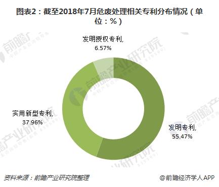 截至2018年7月2日,危廢處理技術(shù)專利申請(qǐng)總量只有137項(xiàng)。其中,發(fā)明專利數(shù)最多,達(dá)到76項(xiàng),占比為55.47%;實(shí)用新型專利數(shù)其次,為52項(xiàng),占比為37.96%;發(fā)明授權(quán)專利數(shù)占比為6.57%??梢?,我國危廢處理行業(yè)技術(shù)還有很大進(jìn)步空間,目前處于較低水平。