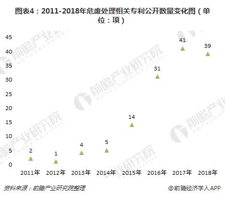在公開專利數(shù)量方面,2011-2017年,我國危廢處理專利公開數(shù)量總體上呈趨勢(shì)。2017年,我國危廢處理專利公開數(shù)量為41項(xiàng),達(dá)到近年來最大值;截至2018年7月,專利公開數(shù)量為39項(xiàng)。