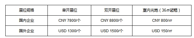 注:1、標(biāo)準(zhǔn)展位:高2.5米,提供三面圍板、中文楣板制作、洽談桌一張、折椅兩把、射燈兩只、10A/220V插座一個;