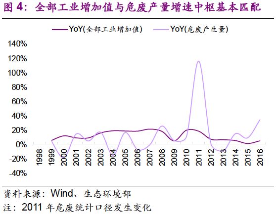 1. 將危廢處置需求與工業(yè)發(fā)展相結(jié)合,從宏觀經(jīng)濟(jì)的角度對危廢產(chǎn)量的變動做出解釋,并通過工業(yè)結(jié)構(gòu)和危廢種類結(jié)構(gòu)的匹配,指出行業(yè)最核心考量因素。