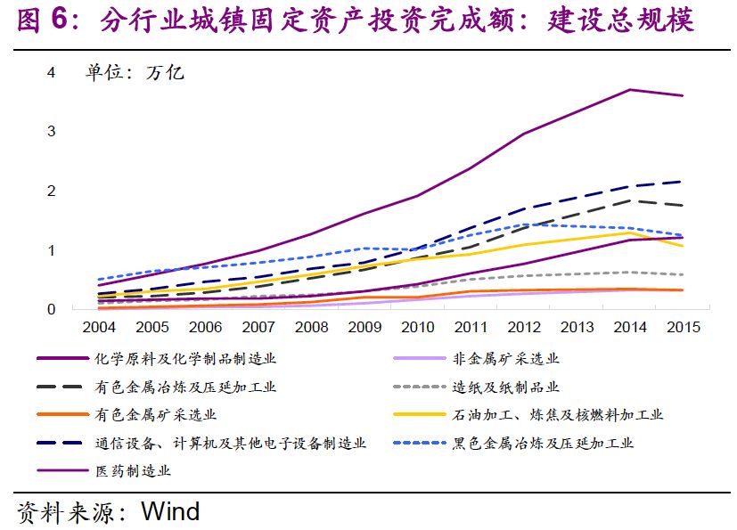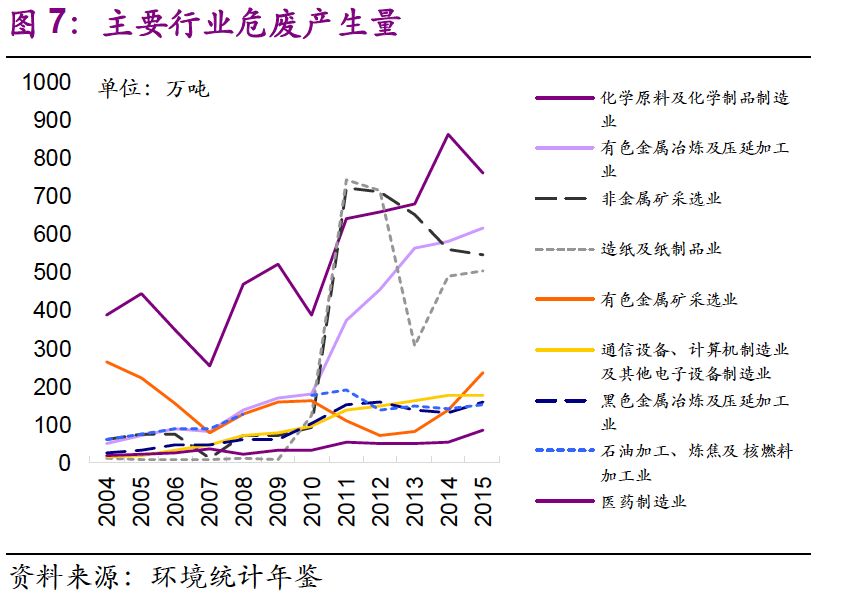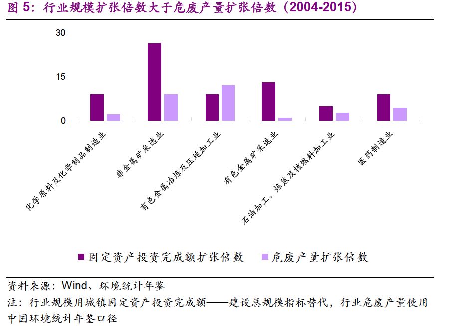 我們也關(guān)注到主要行業(yè)規(guī)模擴(kuò)張倍數(shù)大于危廢產(chǎn)量擴(kuò)張倍數(shù)。從2004年到2015年,化學(xué)原料及化學(xué)制品制造業(yè)、非金屬礦采選業(yè)、有色金屬冶煉及壓延加工業(yè)、有色金屬礦采選業(yè)、石油加工、煉焦及核燃料加工業(yè)、醫(yī)藥制造業(yè)的城鎮(zhèn)固定資產(chǎn)投資完成額——建設(shè)總規(guī)模分別是2004年的9 、26 、9 、13 、5 、9 倍,我國工業(yè)體系得到長足發(fā)展。同期,各行業(yè)危廢產(chǎn)量分別是原來的2 、9 、12、1、3 、4 倍,總體小于建設(shè)總規(guī)模擴(kuò)張倍數(shù)。