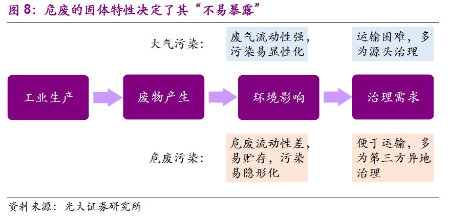 危廢的固體性質(zhì)決定了隱性需求釋放依賴環(huán)保執(zhí)法壓力。按照污染物性質(zhì),可分為廢氣、廢水、固廢三類。就環(huán)境影響來講,廢氣流動性強,污染顯性化,也是最早引起關(guān)注的。危廢多為固體,易于貯存和隱匿,污染呈隱性化。過去環(huán)保執(zhí)法壓力不足,大量危廢被就地掩埋或違規(guī)傾倒,造成了嚴(yán)重的環(huán)境影響。相比大氣治理,危廢污染的總量難以掌握,加上其治理費用高昂,治理需求,尤其是存量的釋放較大程度上依賴環(huán)保執(zhí)法壓力。