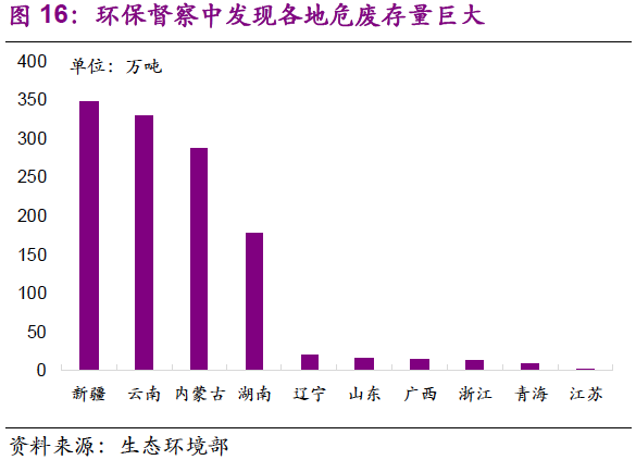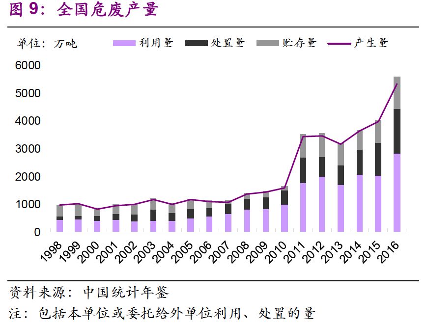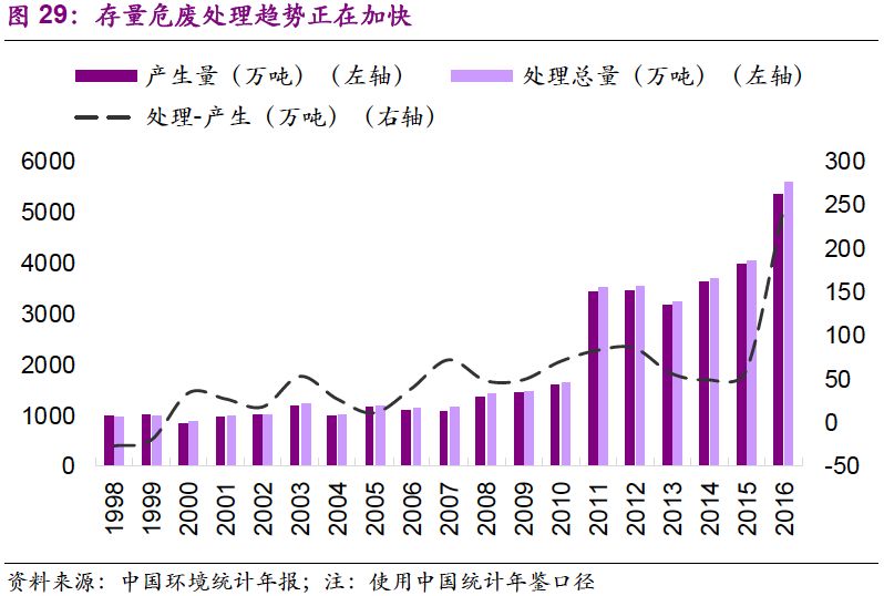 1. 存量危廢處理趨勢正在加快。2016年,以處理總量減去當(dāng)年產(chǎn)生量計算處置往年貯存量,得出處置往年貯存量超過240萬噸,是2015年的4倍。由于環(huán)保壓力加強,大量超期貯存危廢得到處置。同時環(huán)保督察中許多歷史遺留暴露,導(dǎo)致處置量大于產(chǎn)生量,存量消滅趨勢明顯。作為“歷史欠賬”,存量危廢入市是必然趨勢。然而考慮到危廢種類,占存量絕大多數(shù)的危廢并不會直接流向危廢處置企業(yè)。參考存量鉻渣的處理,未來很有可能以專項整治的方式進(jìn)行解決。