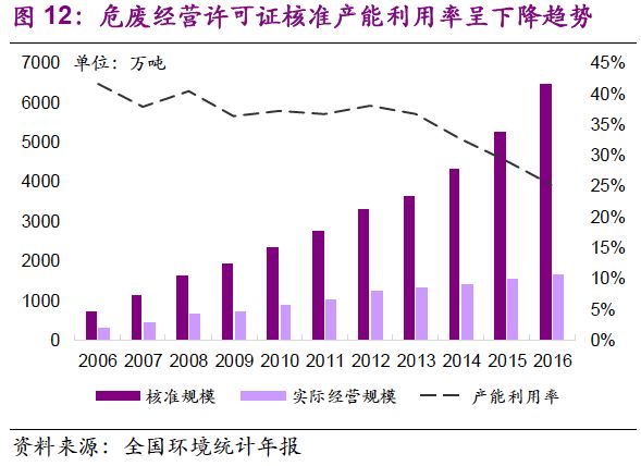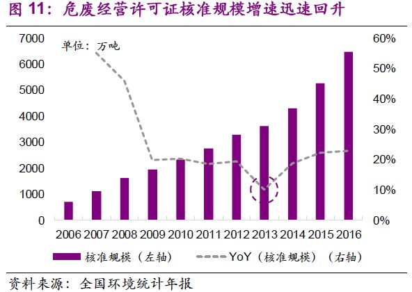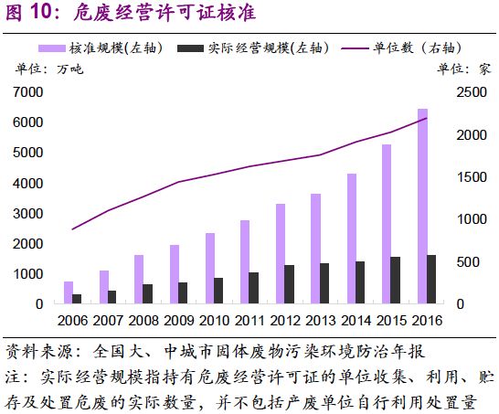 危廢經(jīng)營許可規(guī)模的增加速度與需求釋放速度相當(dāng)。值得注意的是,2013-2016年,全國危廢產(chǎn)量年均復(fù)合增速19%,危廢許可經(jīng)營規(guī)模年均復(fù)合增速21%。截止2016年底,總核準(zhǔn)發(fā)放規(guī)模已達(dá)到6471萬噸。