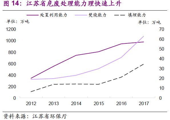 環(huán)保壓力下需求雙層疊加,產(chǎn)能釋放速度有望加快。危廢產(chǎn)業(yè)供需解構(gòu)——需求側(cè):危險廢物處置需求增加的背后,是我國工業(yè)規(guī)模和產(chǎn)品產(chǎn)量的增長。危廢產(chǎn)量與工業(yè)增加值高度相關(guān)(相關(guān)系數(shù)0.91),且具有較強的行業(yè)結(jié)構(gòu)性。同時行業(yè)隱性需求的釋放對環(huán)保壓力較為依賴。供給側(cè):面對需求釋放,危廢許可經(jīng)營發(fā)放規(guī)模表現(xiàn)出較大彈性(2013-2016年CAGR達(dá)21%),但實際經(jīng)營規(guī)模增速有限,由此造成產(chǎn)能利用率進(jìn)一步下降(2013-2016年由37%降至25%)。當(dāng)前,“環(huán)保督察”推動隱性需求釋放、倒逼產(chǎn)業(yè)治理:“歷史存量+當(dāng)期增量”雙層疊加推動“量”的提升,供需不平衡導(dǎo)致區(qū)域“價”的提升,預(yù)計未來2-3年行業(yè)產(chǎn)能釋放速度將加快。