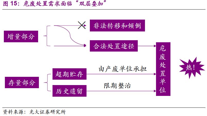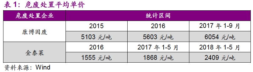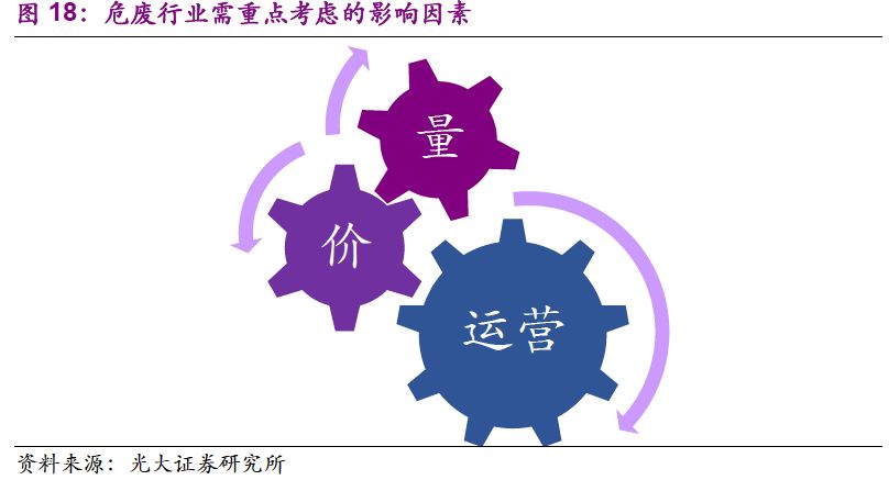 1. “量”的驅(qū)動力已經(jīng)由工業(yè)發(fā)展轉(zhuǎn)變?yōu)榄h(huán)保執(zhí)法:環(huán)保壓力下,危廢處置需求“歷史存量+當(dāng)期增量”雙層疊加,產(chǎn)能釋放速度有望加快;“價”的波動也在反映供需的邊際變化,短期上行、長期回穩(wěn)。