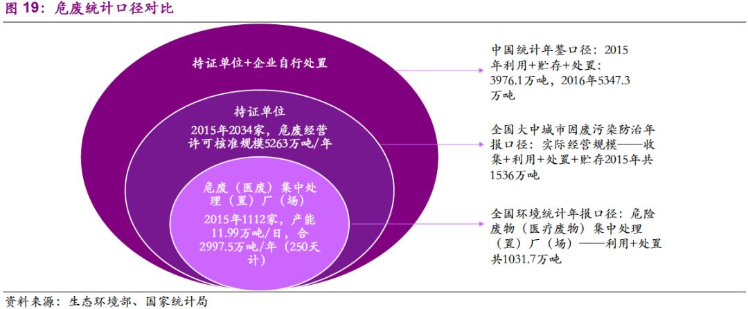 由于統(tǒng)計范圍差異,危廢產(chǎn)生、利用和處置量存在不同口徑值。