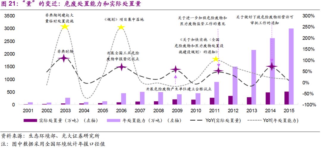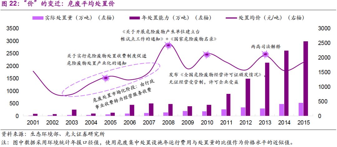 量:處置量提高的驅(qū)動因素已經(jīng)由工業(yè)發(fā)展轉(zhuǎn)變?yōu)榄h(huán)保執(zhí)法。我們認(rèn)為,2001-2008年,實際處置量迅速增長的驅(qū)動力在于國內(nèi)工業(yè)迅速發(fā)展帶動的自然需求,以及“危廢申報制度”、“企業(yè)臺帳制度”等基本制度建立下的規(guī)范化作用;而2011年至今,在工業(yè)體系逐漸成熟的背景下,實際處置量增長的主要驅(qū)動力來自環(huán)保執(zhí)法的強化。
