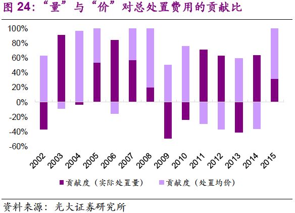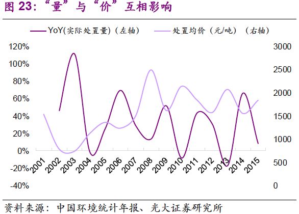 2. 創(chuàng)新性提出“量”和“價”雙驅(qū)動力解析,并對其歷史性波動做出解釋。我們認(rèn)為,處置量提高的驅(qū)動因素已經(jīng)由工業(yè)發(fā)展轉(zhuǎn)變?yōu)榄h(huán)保執(zhí)法,價格波動反映供需邊際變化,短端呈上行趨勢,長端隨著供給提升將逐步回穩(wěn)。