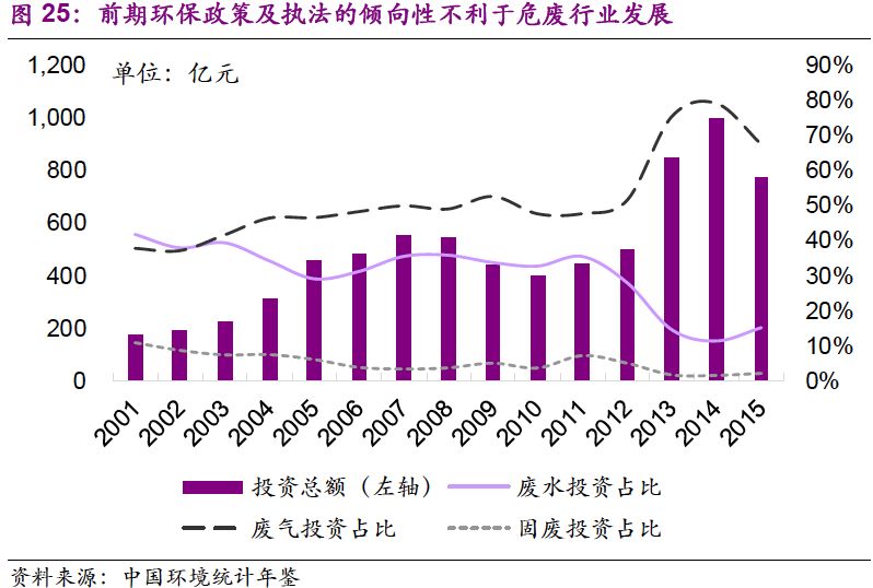 (1)前期環(huán)保政策及執(zhí)法的傾向性不利于危廢行業(yè)發(fā)展。污染的負(fù)外部性決定了環(huán)保行業(yè)規(guī)模主要受需求影響,而需求的釋放來自于政策所指向的環(huán)保壓力。2010年以后,我國的大氣污染是突出的環(huán)境問題,環(huán)保政策和執(zhí)法在一段時間內(nèi)更傾向于此,且采取突擊式的措施進(jìn)行治理;而對其他類型的環(huán)境治理并未采取過于急迫的措施,環(huán)保壓力不足導(dǎo)致危廢處置行業(yè)發(fā)展緩慢和隱性排污情況較為普遍。在投資方面, 2014年,在工業(yè)污染源治理投資中,廢氣和固廢領(lǐng)域占比分別為79.1%和1.5%,工業(yè)固廢投資比例一直較低。