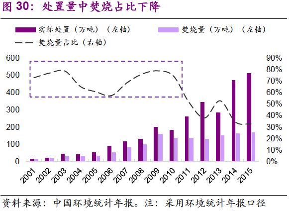 3.處置量中焚燒占比下降,其波動中樞由2001-2010年的70%降至2011-2015年的40%。原因在于危廢行業(yè)市場化運作加強,處置方式呈多元化發(fā)展。自2004年發(fā)改委《關(guān)于實行危險廢物處置收費制度促進(jìn)危險廢物處置產(chǎn)業(yè)化的通知》出臺,危廢行業(yè)市場化趨勢明顯。相比傳統(tǒng)的焚燒、填埋,物化、水泥窯協(xié)同等手段逐漸拓展市場空間?!吨袊h(huán)境統(tǒng)計年報》顯示,2012年后,焚燒+填埋所處置的危廢量占比逐年下降,2015年已降至50%。另一方面,當(dāng)前以焚燒為代表的無害化產(chǎn)能稀缺,我們認(rèn)為短期內(nèi)“補短板”效應(yīng)為主要因素。從長期來看,隨著循環(huán)經(jīng)濟(jì)的不斷推動,處置會趨于精細(xì)化,各種處置方式將均衡發(fā)展。