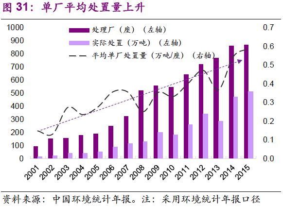 2. 單廠處置量上升,平均規(guī)模由2001年的0.15萬噸/座提升至2015年的0.6萬噸/座。開始階段,危廢處置小型企業(yè)居多,處理方式粗獷、簡單。隨著標(biāo)準(zhǔn)趨嚴(yán),設(shè)備和技術(shù)的提高,單廠處置量大的企業(yè)具備規(guī)模效應(yīng)。當(dāng)前,危廢行業(yè)景氣度的提高,已引起資本市場關(guān)注,如雅居樂、東方園林、中信產(chǎn)業(yè)基金等跨界者強勢進(jìn)入,并通過行業(yè)兼并等方式逐漸規(guī)?;?。
