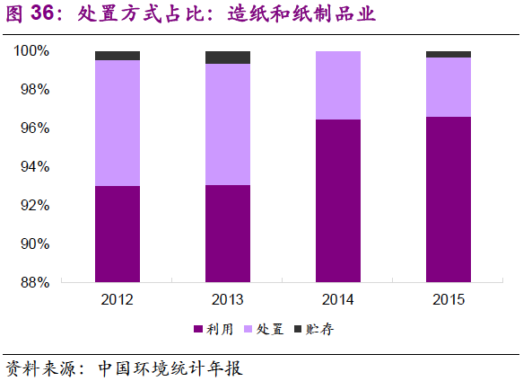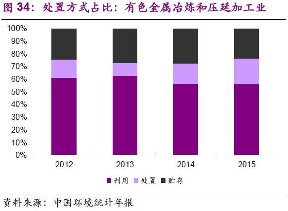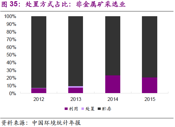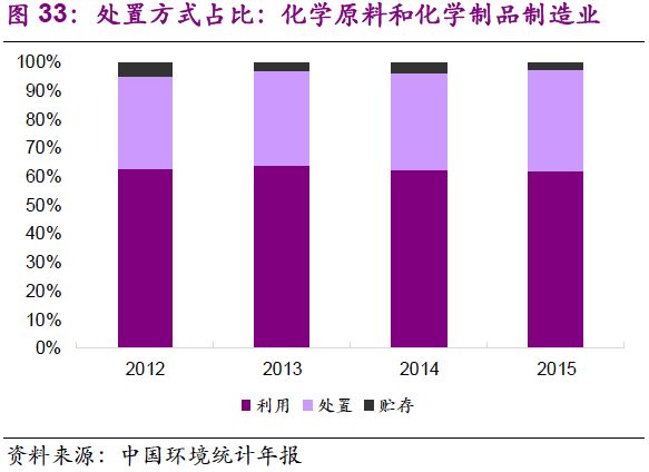 5. 在主要產(chǎn)廢行業(yè)中,危廢的利用和處置占比變化不大?;瘜W(xué)原料和化學(xué)制品制造業(yè):2012-2015年,行業(yè)危廢綜合利用率在62%~64%之間窄幅振動,處置率為32%~35%;有色金屬冶煉和壓延加工業(yè):2012-2015年,行業(yè)危廢綜合利用率在56%~63%之間窄幅振動,處置率為11%~20%;非金屬礦采選業(yè):2012-2015年,行業(yè)危廢貯存率小幅下降,由2012年的93%降至2015年的79%,利用率由7%提升至21%,主要是石棉廢物的綜合利用取得進(jìn)展。造紙和紙制品業(yè):行業(yè)危廢綜合利用率較高,且小幅上升,至2015年已達(dá)97%。