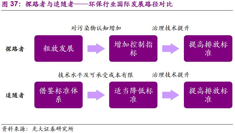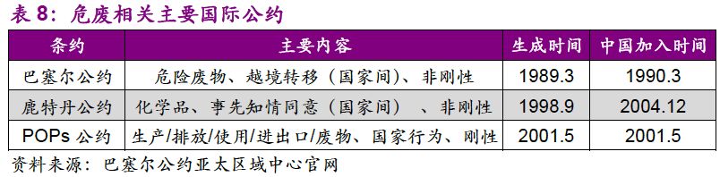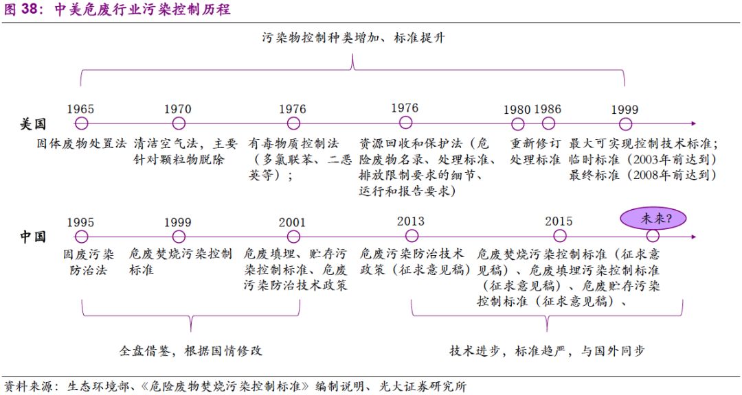 縱觀國際,我們認(rèn)為中國危廢行業(yè)在技術(shù)和標(biāo)準(zhǔn)上屬于“追隨者”,具備“早熟”的特點。由于工業(yè)發(fā)展較快,發(fā)達(dá)國家的環(huán)保意識率先覺醒。隨著對污染物的認(rèn)知提升,行業(yè)標(biāo)準(zhǔn)趨嚴(yán),技術(shù)規(guī)范性逐漸提高。到了20世紀(jì)90年代,發(fā)達(dá)國家“探路者”的工作已基本完成。發(fā)展中國家雖與發(fā)達(dá)國家在工業(yè)及環(huán)保行業(yè)起步具有時間的滯后性,但在行業(yè)發(fā)展初期可以對整套標(biāo)準(zhǔn)及技術(shù)規(guī)范進(jìn)行借鑒,從而具備“早熟”的特點。