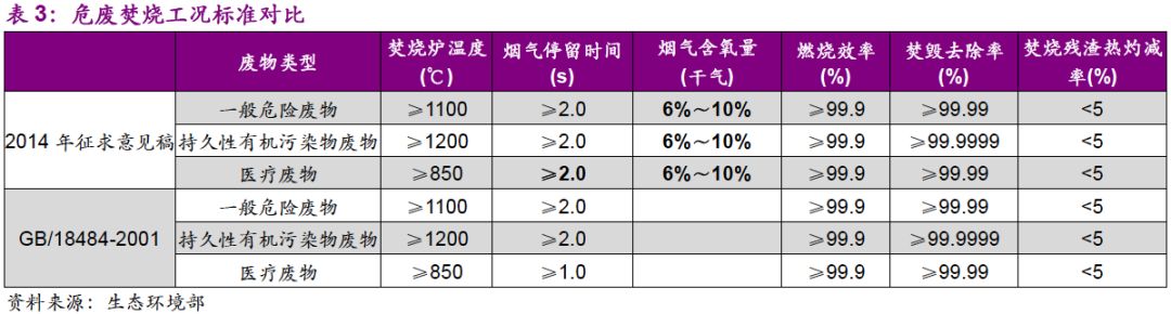 隨著對危廢焚燒條件掌握成熟,征求意見稿首先對危廢燃燒工況標(biāo)準(zhǔn)做了提高。相比GB/18484-2001,新增煙氣含氧量(干氣)指標(biāo),醫(yī)療廢物的煙氣停留時間限值由1 s改為2 s。