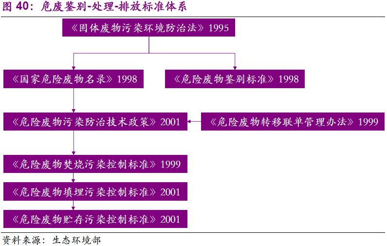 1995年《固廢法》的出臺,標(biāo)志著我國危廢行業(yè)的起步?!豆腆w廢物污染環(huán)境防治法》首次從法律層面涉及危廢管理,同時提及經(jīng)營許可證、危險廢物轉(zhuǎn)移聯(lián)單、國家危險廢物名錄,而三者落地的時間分別為2004、1999和1998年。從1995-2002年,我國基本建立起危廢處理處置從鑒別-處理-排放的標(biāo)準(zhǔn)體系。