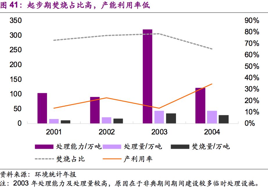 這一時期,焚燒占比維持在70%左右,產(chǎn)能利用率維持在20%左右。危廢處理以焚燒為主,我們認(rèn)為原因有二:一是第一版《危險廢物名錄》中危廢種類尚未健全;二是資源化技術(shù)落后,大部分危廢只能通過焚燒處理。