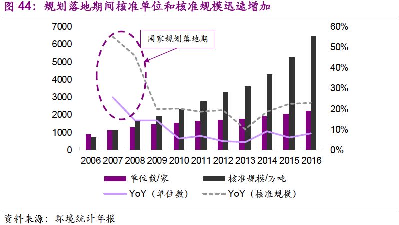 2013年,危廢入刑推動行業(yè)進(jìn)入全新階段。2013年6月,最高人民法院、最高人民檢察院通過《關(guān)于辦理環(huán)境污染刑事案件適用法律若干問題的解釋》,規(guī)定非法排放、傾倒、處置危險廢物三噸以上的,應(yīng)當(dāng)認(rèn)定為“嚴(yán)重污染環(huán)境”。危廢入刑直接推動危廢行業(yè)進(jìn)入全新階段,年核準(zhǔn)規(guī)模增量一躍而起,并逐年創(chuàng)新高。