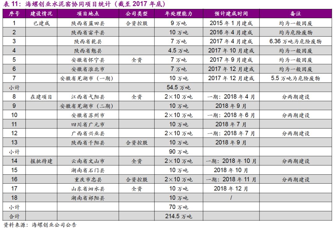 截至2017年底,公司利用水泥窯處理工業(yè)固廢及危廢業(yè)務(wù)共有在建項目6個,已建成投產(chǎn)項目7個,已建成項目年處理能力約為54.5萬噸。2017年工業(yè)固廢及危廢處理量共10.90萬噸,其中危廢為5.17萬噸、一般固廢為5.73萬噸。