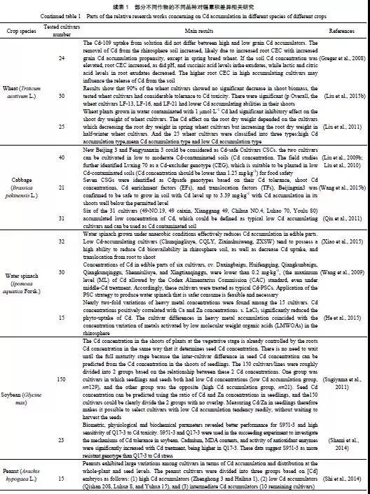 不同作物種類對(duì)鎘的累積量有所差異,例如鎘污染土壤中豆類作物(豆科Leguminosae)鎘累積量較低,根菜類蔬菜(傘形科Umbelliferae和百合科Liliaceae)鎘累積量居中,而葉類蔬菜(菊科Asteraceae和藜科Chenopodiaceae)鎘累積量相對(duì)較高。而同種作物的不同品種(基因型)的鎘吸收累積也存在差異,已有研究表明,水稻(Oryza sativa L.)、大麥(Hordeum vulgare L.)、玉米(Zea maysL.)、小麥、胡蘿卜(Daucus carota L.)、大白菜、豌豆(Pisum sativum L.)、土豆(Solanum tuberosum L.)、花生(Arachis hypogaea L.)及空心菜(Ipomoea aquatica Forsk.)等農(nóng)作物的不同品種鎘吸收累積量差異較大。表1 列舉了部分有關(guān)不同種類作物的基因型差異對(duì)鎘吸收累積的研究及相關(guān)結(jié)論,已有的研究均表明篩選低累積作物對(duì)于中低濃度鎘污染土壤的安全利用具有可行性。
