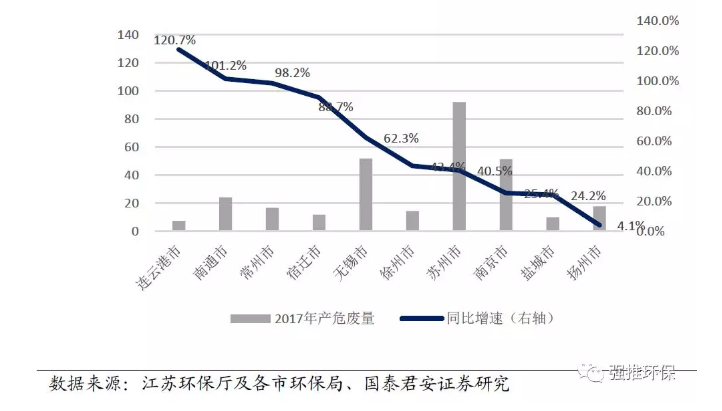 2017年,江蘇主要城市危廢產(chǎn)生量較2016年同比大增,其中連云港、南通、常州、宿遷、無(wú)錫同比增速都超過(guò)50%。