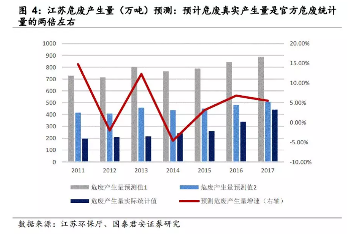 而我們預(yù)測(cè)江蘇危廢實(shí)際產(chǎn)生量是官方統(tǒng)計(jì)量的兩倍左右: