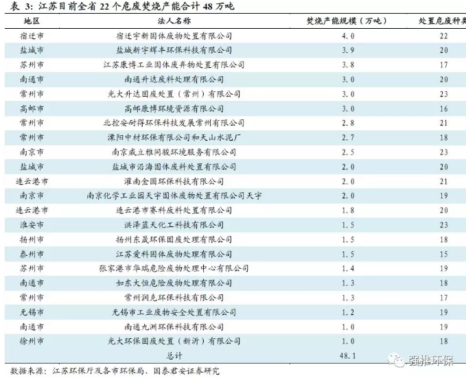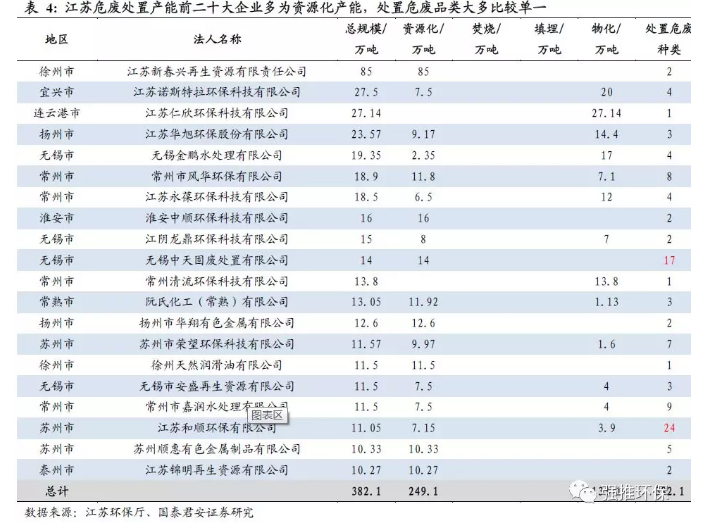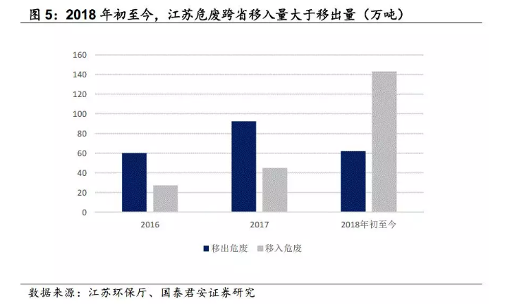 我們觀察到,單體處置產(chǎn)能全省排名第一的江蘇新春興再生資源公司,2018年初至今已從外省合計(jì)轉(zhuǎn)入8.6萬(wàn)噸HW49危廢,預(yù)計(jì)外省危廢處置是其業(yè)務(wù)的重要組成部分。
