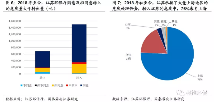 2018年初至今,江蘇環(huán)保廳同意和擬同意轉(zhuǎn)出江蘇省的危廢62萬(wàn)噸、轉(zhuǎn)入江蘇省的143萬(wàn)噸。