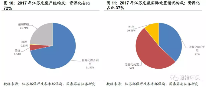 如同上文所提到的,江蘇省產(chǎn)能中,資源化、無(wú)害化占比分別為72%、28%,以2017年為例,當(dāng)年資源化、無(wú)害化處置實(shí)際處置占比分別為37%、52%,表明江蘇資源化過(guò)剩、無(wú)害化不足現(xiàn)象明顯。具體看來(lái):