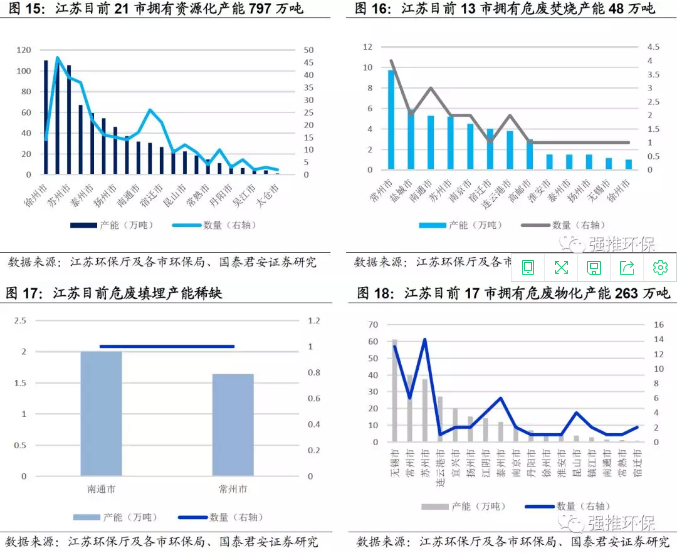 21市擁有資源化產(chǎn)能797萬(wàn)噸;17市擁有危廢物化產(chǎn)能263萬(wàn)噸;13市擁有危廢焚燒產(chǎn)能48萬(wàn)噸;2市擁有危廢填埋產(chǎn)能3.64萬(wàn)噸。