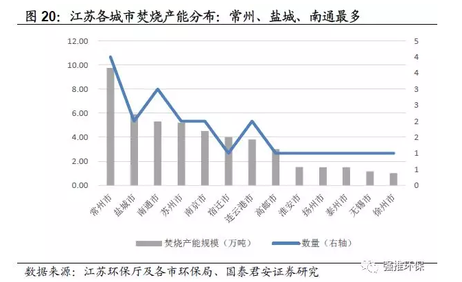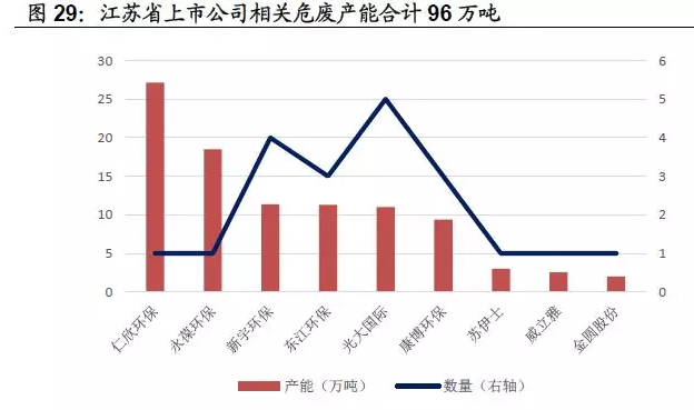 江蘇危廢處置牌照1110萬(wàn)噸,品類全面。截止2018年4月,江蘇省一共核準(zhǔn)374個(gè)危廢經(jīng)營(yíng)許可證,危廢處置產(chǎn)能達(dá)到1110萬(wàn)噸,大于我們預(yù)測(cè)的危廢產(chǎn)生量900萬(wàn)噸,其中:無(wú)錫、蘇州、常州、徐州、泰州為江蘇危廢處置產(chǎn)能量排名前五。同時(shí)江蘇省危廢處置品類全面,擁有除HW15以外的45大類危廢產(chǎn)能。