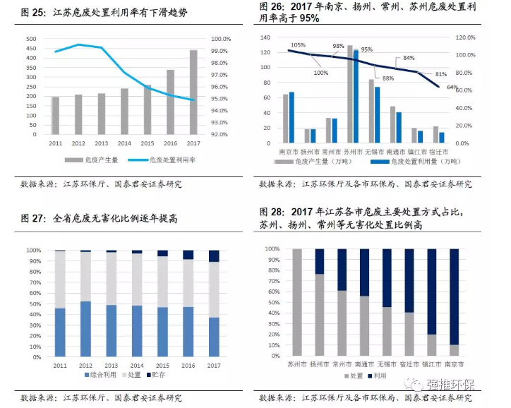 從各市的情況來(lái)看,2017年南京、揚(yáng)州、常州、蘇州危廢處置利用率高于95%,無(wú)錫、南通、鎮(zhèn)江的危廢處置利用率在80%-90%之間。