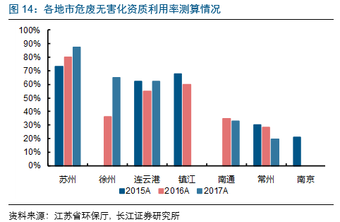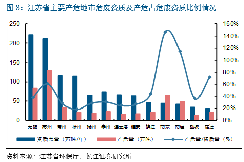 宿遷及蘇州危廢產(chǎn)量/危廢資質(zhì)量均超過60%,危廢產(chǎn)能供給適中。