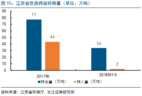 2017年跨省轉(zhuǎn)出危廢約77萬噸,集中去浙江/安徽/江西。