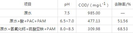 燒杯實(shí)驗(yàn)發(fā)現(xiàn),采用氫氧化鈣將該污水處理廠進(jìn)水pH控制在8.0~8.5,然后控制硫酸亞鐵和聚丙烯酰胺(PAM)的投加質(zhì)量濃度分別為200、3mg/L,可獲得最佳混凝效果;在實(shí)際廢水處理過(guò)程中,可較快形成大且穩(wěn)定的礬花,沉淀時(shí)間短,出水濁度低,水質(zhì)清澈透明。表2為聚合氯化鋁(現(xiàn)有污水處理廠預(yù)處理段混凝池所用藥劑)和硫酸亞鐵對(duì)該污水處理廠廢水的處理效果,結(jié)果顯示,以硫酸亞鐵為混凝劑,PAM為助凝劑,氫氧化鈣為pH調(diào)節(jié)劑,混凝處理效果較佳。