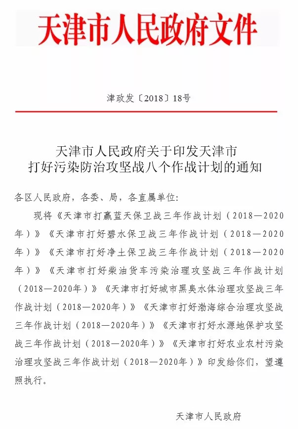 今年起三年污染防治攻堅(jiān)戰(zhàn)應(yīng)該怎么打?天津市劃出了最新“時(shí)間表”“路線圖”。天津市政府昨天發(fā)布《關(guān)于打好污染防治攻堅(jiān)戰(zhàn)八個(gè)作戰(zhàn)計(jì)劃的通知》,標(biāo)志天津市今起全面打響藍(lán)天、碧水、凈土等三年八大戰(zhàn)役。該通知包括了藍(lán)天保衛(wèi)戰(zhàn)、碧水保衛(wèi)戰(zhàn)、凈土保衛(wèi)戰(zhàn)、柴油貨車污染治理、城市黑臭水體治理、渤海綜合治理、水源地保護(hù)、農(nóng)業(yè)農(nóng)村污染治理等8方面的具體計(jì)劃。