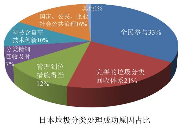 日本的垃圾分類經(jīng)過四十多年的發(fā)展,至今已擁有了成熟的市場機制、完善的法律體系和完整的回收產(chǎn)業(yè)鏈,日本垃圾處理成功的關鍵與全民參與、完善的回收體系、管理措施、企業(yè)的技術創(chuàng)新以及政府主導密切相關(見餅狀圖),也正因如此,日本在循環(huán)經(jīng)濟領域一直走在世界前列。