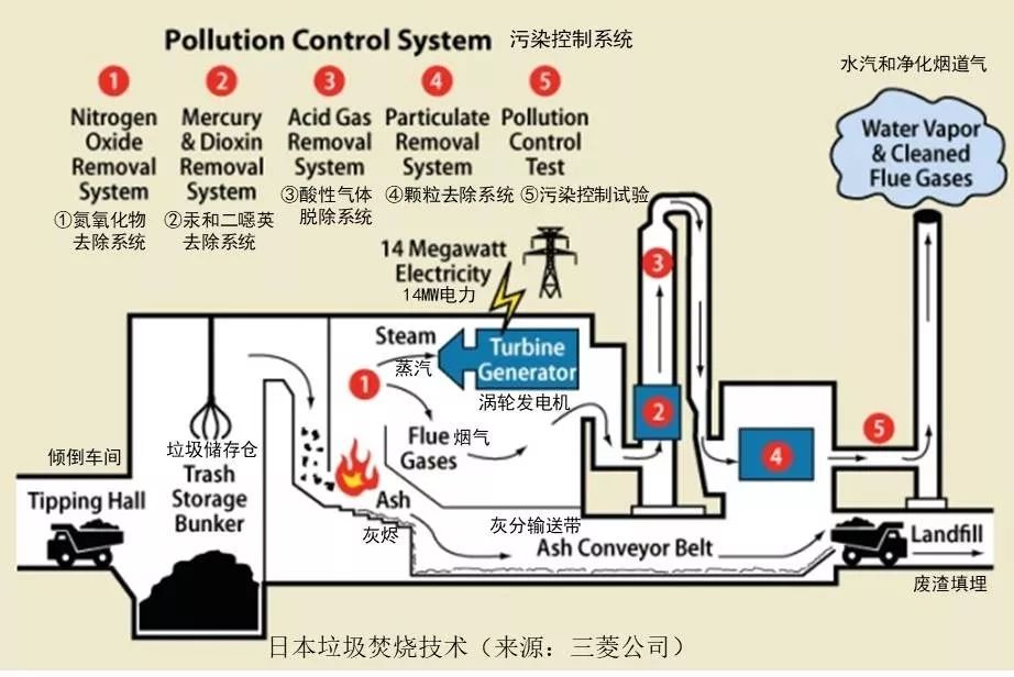 日本的垃圾處理技術主要包括生產(chǎn)廢棄物固體燃料以及垃圾生物降解,80%的生活垃圾通過焚燒處理,填埋僅占1.3%,其它部分通過破碎、分選等方式處理。日本是目前生活垃圾焚燒技術最先進的國家,垃圾焚燒廠的數(shù)量位居世界第一,焚燒爐型主要有爐排爐(下圖是以三菱公司為代表的焚燒技術路線)、流化床焚燒爐和氣化熔融爐。
