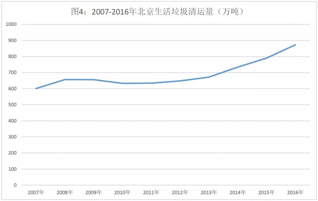 以北京為例,2007-2016年十年間,生活垃圾清運量增長了45%,同期人口數(shù)量增長29.7%,遠(yuǎn)低于垃圾清運量的增長??梢?,北京市居民最能“掙錢”,同時產(chǎn)生垃圾的能力在不斷的“增強(qiáng)”。