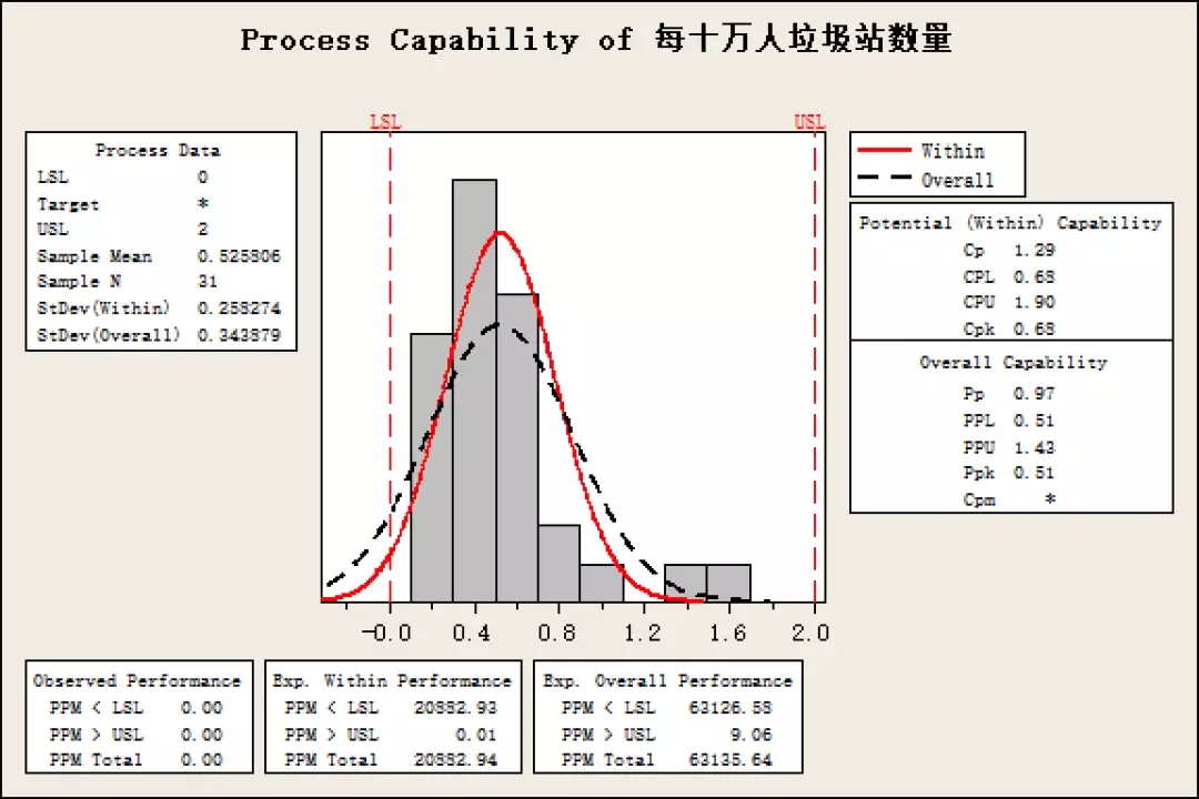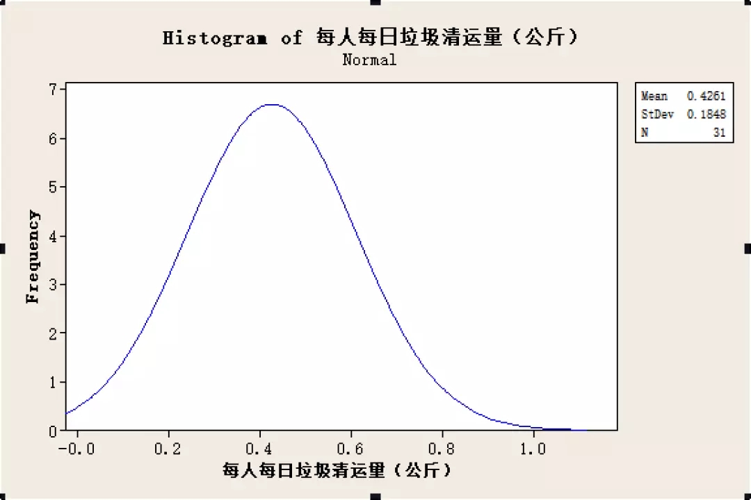 根據(jù)對每日垃圾清運量數(shù)據(jù)的直方圖以及正態(tài)分布圖,可以看出,全國各大省市的每日人均垃圾清運量基本符合正態(tài)分布,其中大部分省市的人均每日清運量在0.2-0.6公斤之間,平均值為0.42公斤。