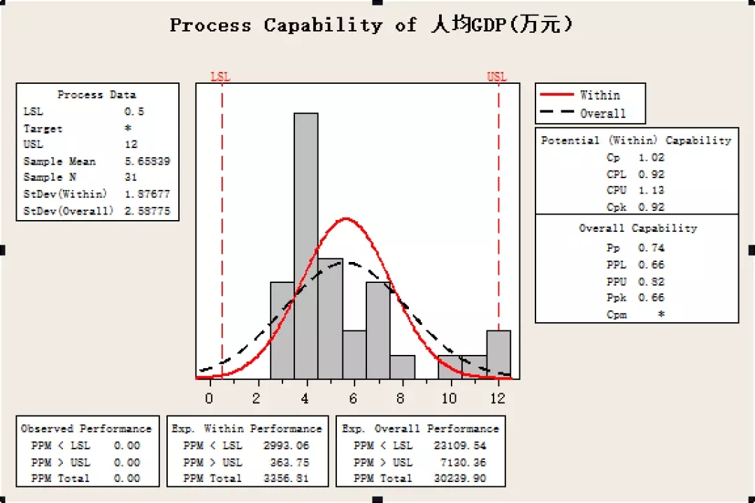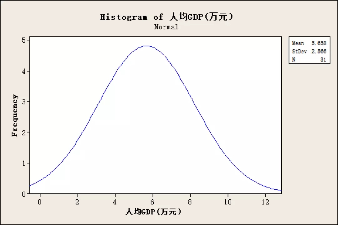通過對全國各大省市人均GDP直方圖及正態(tài)分布圖進(jìn)行分析,人均GDP的分布也服從正態(tài)分布,大部分省市的年人均GDP位于4-7萬元區(qū)間,全國省市人均GDP均值為5.66萬元。