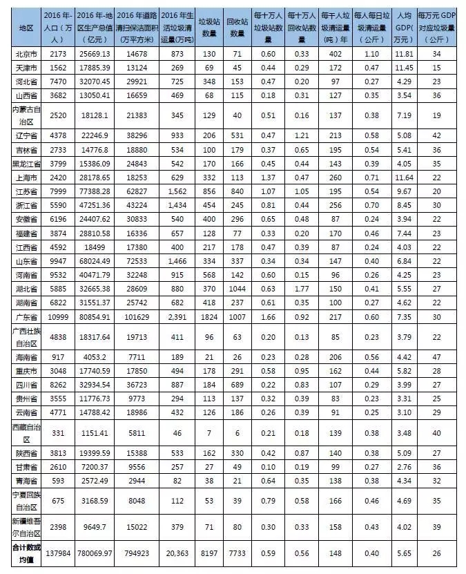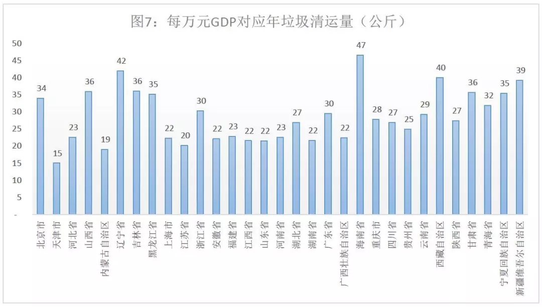 從這個角度將,海南、遼寧省每萬元GDP對應(yīng)的年垃圾清運量分別是47、42公斤,居全國前列。天津市每萬元GDP對應(yīng)年垃圾清運量15公斤,不考慮其他因素,單從該數(shù)據(jù)上看,天津的GDP是最“衛(wèi)生”的GDP。