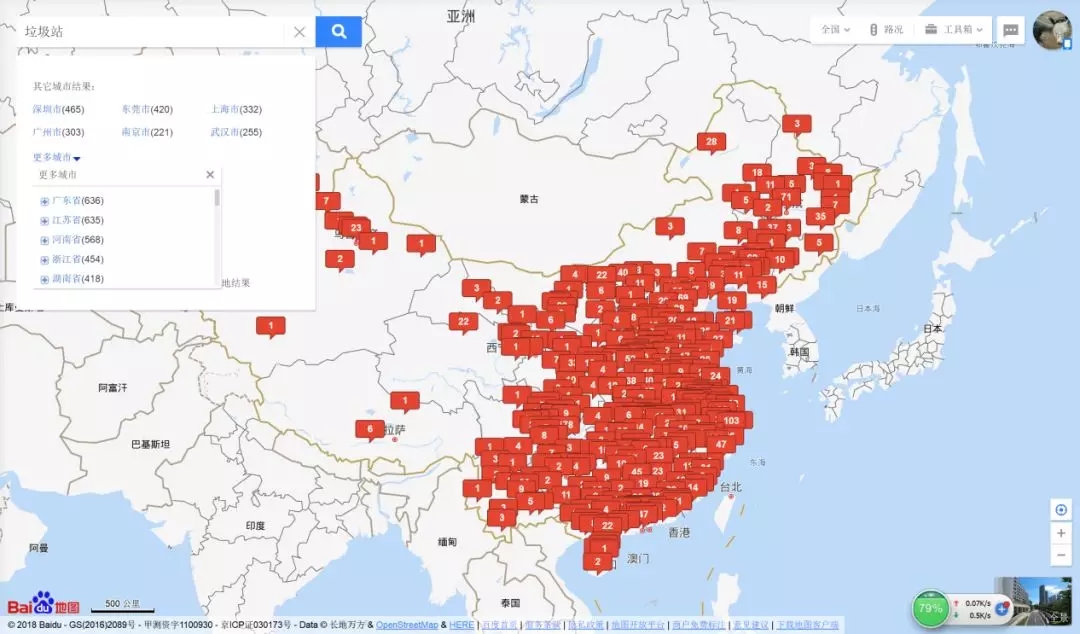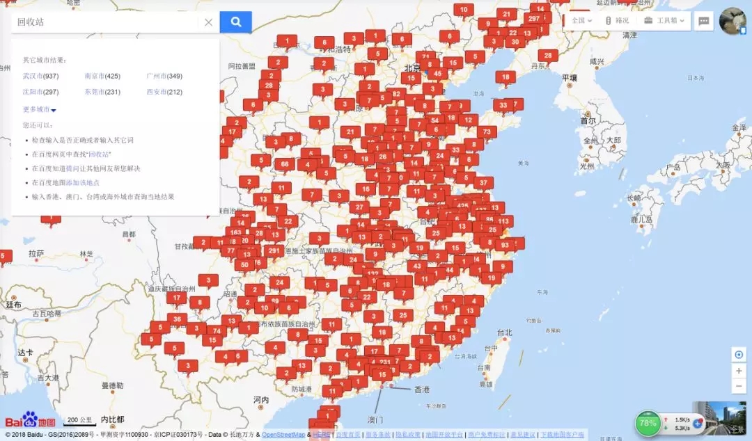 通過百度地圖對回收站及垃圾站兩個關(guān)鍵詞進(jìn)行搜索,出現(xiàn)如下兩張圖注1,垃圾站與回收站恐怕是普通居民最不愿意接觸的地方之一,但是通過百度地圖搜索,作者發(fā)現(xiàn),垃圾站和回收站幾乎是人口和經(jīng)濟(jì)的標(biāo)志之一,哪里人口密集和經(jīng)濟(jì)發(fā)達(dá),哪里的垃圾站和回收站就密集,根據(jù)對百度地圖數(shù)據(jù)統(tǒng)計,全國垃圾站數(shù)量、回收站數(shù)量分別為8197個、7733個,其中北京市垃圾站、回收站數(shù)量分別為130個、71個。