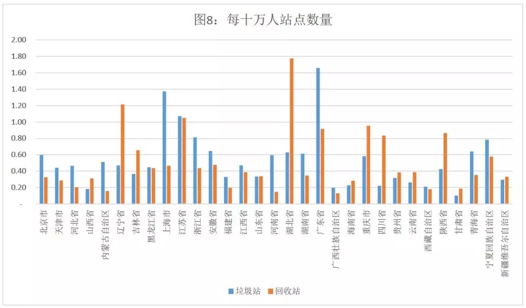 而對全國各省市每十萬人擁有的垃圾站數(shù)量及回收站數(shù)量統(tǒng)計分析,可以看出,全國大部分省市每十萬人擁有的垃圾站數(shù)量在0.3-0.7個之間,平均數(shù)為0.5個;每十萬人擁有的回收站數(shù)量在0.3-0.5個之間,平均數(shù)為0.5個。